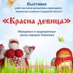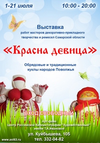1 июля  в 13.00 в арт-фойе ЦРК «Художественный» им. Т.А. Ивановой (ул. Куйбышева, 103/105) состоится открытие выставки  работ мастеров декоративно-прикладного творчества и ремесел Самарской области «Красна девица» (обрядовые и традиционные куклы народов Поволжья). Выставка продлится до 21 июля и будет работать ежедневно с 10.00  до 21.00. Вход свободный. Организатор выставки: государственное бюджетное учреждение культуры «Агентство социокультурных технологий».