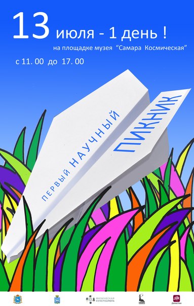 13 июля с 11.00 до 17.00 Музей "Самара Космическая" проводит Первый "Научный Пикник"! Выставка научно-популярных интерактивных экспонатов проводится на прилегающей территории и в музее бесплатно. Экспозиция будет интересна детям и их родителям, педагогам и дизайнерам, студентам и пенсионерам. Авторы, создававшие экспонаты, стремились не только к научной точности, но и к тому, чтобы экспонаты были действительно современными и впечатляющими. Разнообразные экспонаты, красивые, интересные, познавательные, которые можно и нужно трогать руками. Авторы данных разработок продемонстрируют их работу, а также позволят активно поучаствовать зрителям в процессе. МВЦ «Самара Космическая» покажет авторские анимационные фильмы, рассказывающие о пребывании космонавтов в космосе (питание, быт, гигиена…), проведет игры и занятия. Подробности http://vk.com/samaraspace