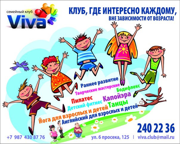 16 сентября, в воскресенье, состоится праздничное открытие нового семейного клуба "Вива"! В 11.00 в клубе ждут вас и ваших детей в гости - будут презентации, демо-занятия, мастер-классы, выставка и веселый детский праздник!   ПРОГРАММА ПРАЗДНИКА: 11.00 – 13.00 игровая комната – детский праздник Скоморохи, конкурсы, аквагрим, фигурки из шариков 11.00 – 13.00 зал йоги – презентация наших основных направлений: Раннее развитие Курсы для беременных, курсы молодых мам Танцевальная студия «Конфетти» Английский язык для детей и взрослых 13.00 -14.00 – зал йоги – мастер-класс по изготовлению игрушки-оберега 14.00 – 15.00 – зал йоги – выставка-презентация работ руководителей мастер- классов (бисероплетение, валяние из шерсти, изготовление украшений) 15.00 – 16.30 – зал йоги – мини-занятие по пилатесу, презентация интенсивного курса по бодифлексу 17.00 – 18.00 – зал йоги – демо-занятие по восточным танцам В течение дня у Вас будет отличная возможность познакомиться с командой клуба, задать все интересующие вопросы, приобрести абонементы, отлично провести время всей семьей! Адрес: ул. 6 просека, 125 Телефоны: тел. 240 22 36, 8 987 430 87 76 http://vk.com/club41998409