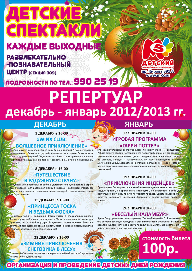 Где: ТЦ Детский М5 (пересечение Московского шоссе и пр. Кирова. Тел.: 972-02-12) В  ТРЦ "Детский" есть единственная в Самаре концертная площадка на базе торгового центра! У ТРЦ есть  уютный зрительный зал на 100 человек, большая, хорошо просматриваемая сцена со всем необходимым оборудованием. Артисты приятно удивляют всех профессионально поставленными спектаклями! Театральные представления для детей каждую субботу в 16.00. 1 декабря Winx клуб: волшебное приключение. Хочешь окунуться в волшебный мир Винкс с головой? Поучаствовать в приключениях Винкс и их друзей, сразиться на стороне Винкс против Трикс и других злодеев? Тогда вместе с Винкс ты отправишься в школу Алфея, где узнаешь разные тайны и секреты фей, а также поможешь им в учебе. 8 декабря  Путешествие в радужную страну. Клоунесса Ляля приглашает ребят в удивительную страну ярких красок! Ляля расскажет сказку о красках и радужной стране, все вместе мы узнаем, что означают слова "каждый охотник желает знать, где сидит фазан". 15 декабря  Принцесса Тоска и ведьма Фоска. Принцесса Тоска и ведьмочка Фоска учатся в специальных школах: Фоска в ужасной школе для ведьм, а Тоска в прекрасной школе для принцесс, но и у той, и у другой девочки плохие оценки. Вместе с ребятами принцесса и ведьмочка побывают на уроках в разных школах и выполнят разные волшебные задания. 22 декабря  Зимние приключения снеговика в лесу. Отважны снеговик отправляется через волшебный лес, чтобы доставить письма ребят Деду Морозу.