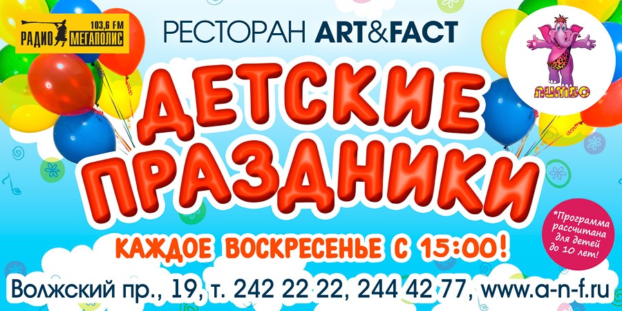 Веселое воскресенье в "Art&Fact" Что: детский праздникГде: Волжский проспект, 19 (напротив бассейна СКА)Когда: 30 октября (ВС) в 15:00Вход: для детей - 100 руб., взрослым - свободный.Возраст участников: до 10 лет