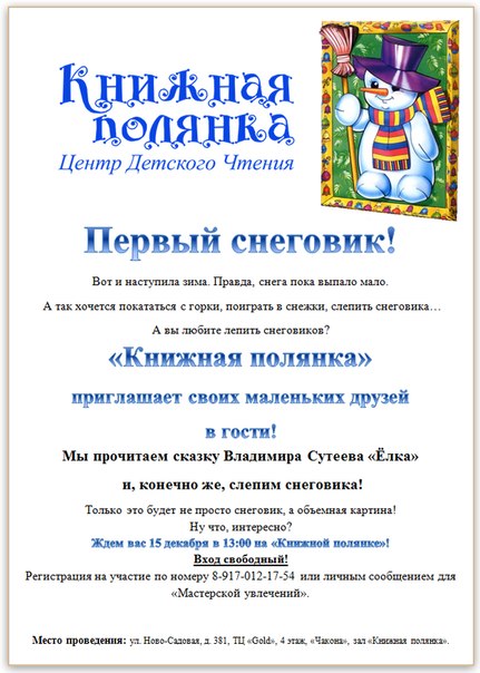 Вот и наступила зима. Правда, снега пока выпало мало. А так хочется покататься с горки, поиграть в снежки, слепить снеговика… А вы любите лепить снеговиков? «Книжная полянка»  приглашает своих маленьких друзей в гости! Ребята  прочитают сказку Владимира Сутеева «Ёлка» и, конечно же, слепят снеговика. Только это будет не просто снеговик, а объемная картина! Ну что, интересно?  15 декабря в 13:00 на «Книжной полянке», вход свободный, но регистрация обязательна. Регистрация на участие по номеру 8-917-012-17-54 или личным сообщением Вконтакте  для «Мастерской увлечений». Место проведения: ул. Ново-Садовая, д. 381, ТЦ «Gold», 4 этаж, «Чакона», зал «Книжная полянка». Мероприятие Вконтакте http://vk.com/event46826266