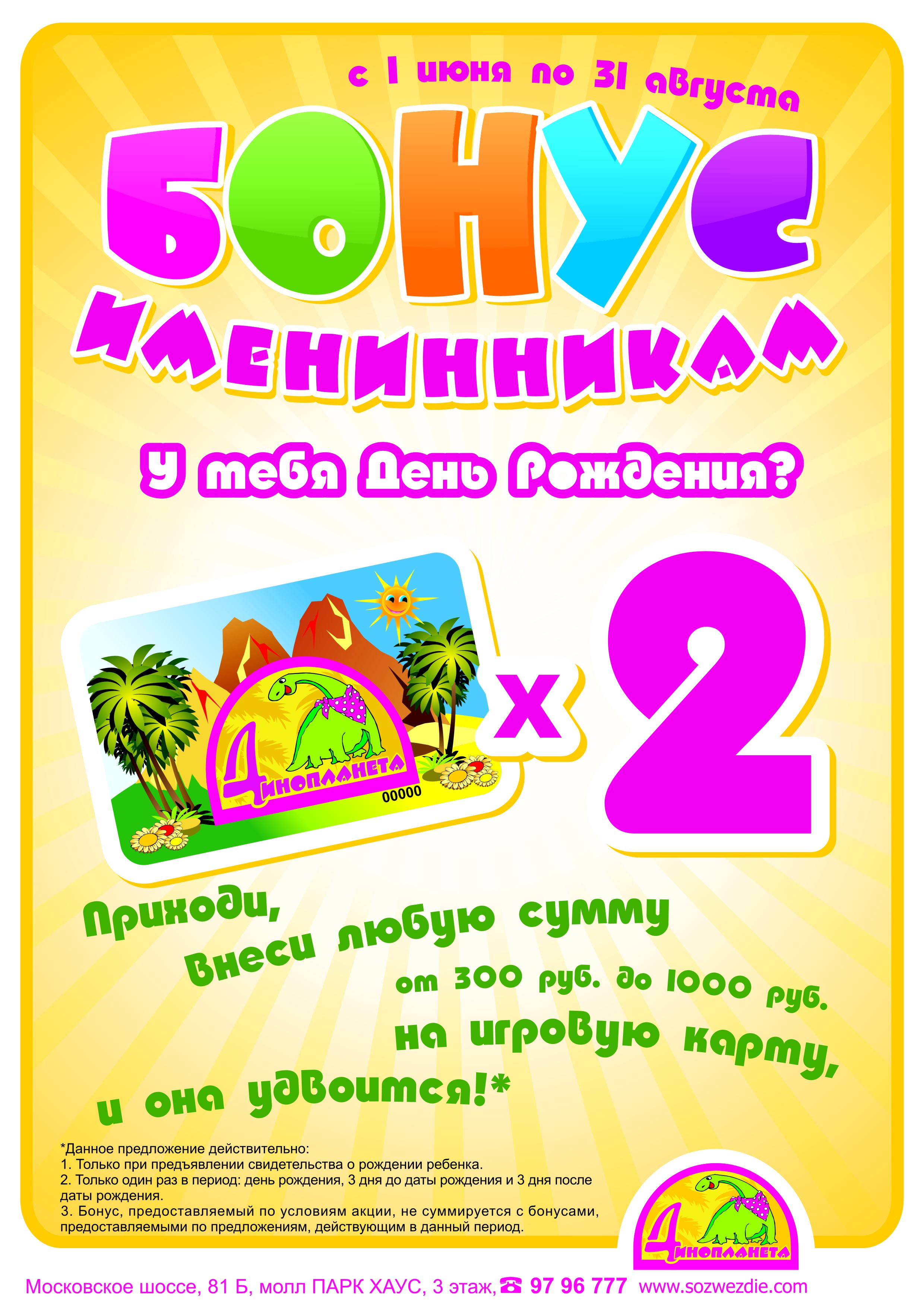 На этом предложения счастливчикам, у которых День рождения летом, не заканчиваются: внеси на свою карту любую сумму от 300 руб. до 1000 руб. и она удвоится!