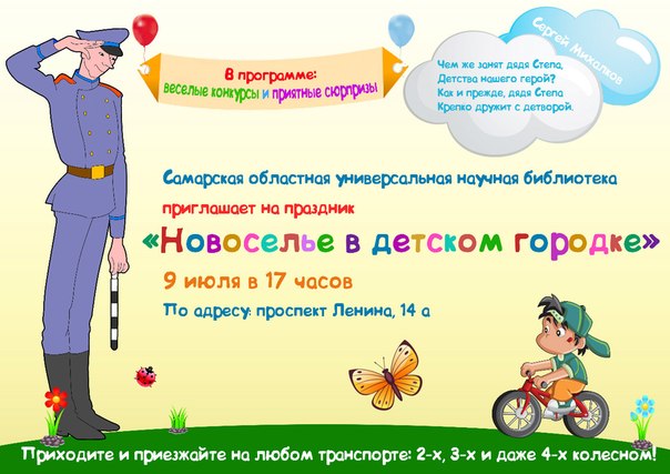 Помните, мы писали о том, что скоро в Самаре появится чудесная детская площадка? Уже завтра она откроется! 9 июля в 17.00 в "Детском городке" около Самарской областной научной библиотеки состоится праздничное новоселье. В программе весёлые конкурсы, знакомство с правилами дорожного движения для маленьких и даже самых маленьких водителей и пешеходов, а также их родителей. Непременно всем гостям подарки и мороженое! Можно приехать на своем транспорте, например, двух или трехколесном :)