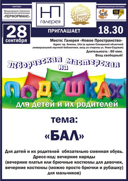 Мы уже  приглашали  всех желающих поучаствовать в интерактивной, эстрадно-театрализованной программе для детей и их родителей в рамках творческой лаборатории «Театральная мастерская на подушках». Мастерская такого нового и необычного формата будет работать и дальше, следите за анонсами на нашем сайте - у каждой новой программы будет своя тема и свой детский дресс-код. А сегодня наш постоянный автор Кэти Фли и ее дочка  делятся своими впечатлениями от прошедшего мероприятия - 28 сентября  в галерее «Новое пространство» юные посетители стали участниками настоящего костюмированного бала: