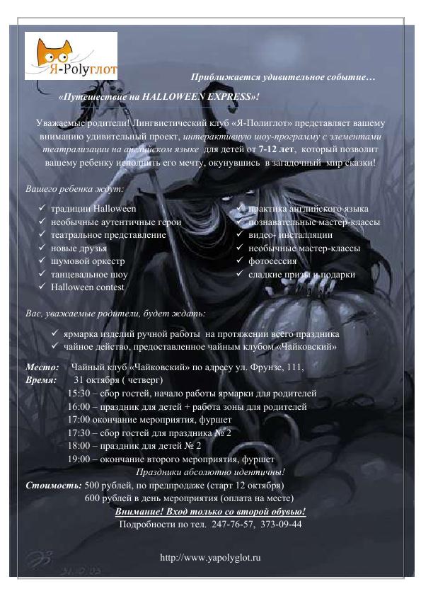 Лингвистический клуб "Я—Полиглот" приглашает детей и их родителей, интерактивную шоу-программа с элементами театрализации на английском языке для детей от 7-12 лет, посвященную празднику Halloween.